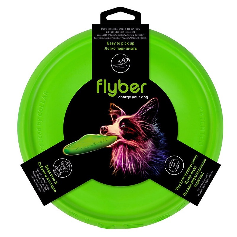 Благодаря оптимальному размеру, уникальной форме и материалу, он отлично подходит для игр с собаками различных пород и размеров. Даже собаки, которые ранее не проявляли интереса к играм с летающими тарелками, не могут устоять перед Флайбером. Ведь в отличие от спортивных фрисби его можно кусать. Собака испытывает настоящий восторг, когда ее зубы легко входят в толщу материала. И даже если ей не удается поймать Флайбер на лету, она легко может подхватить его с земли, получив таким образом желаемое вознаграждение.