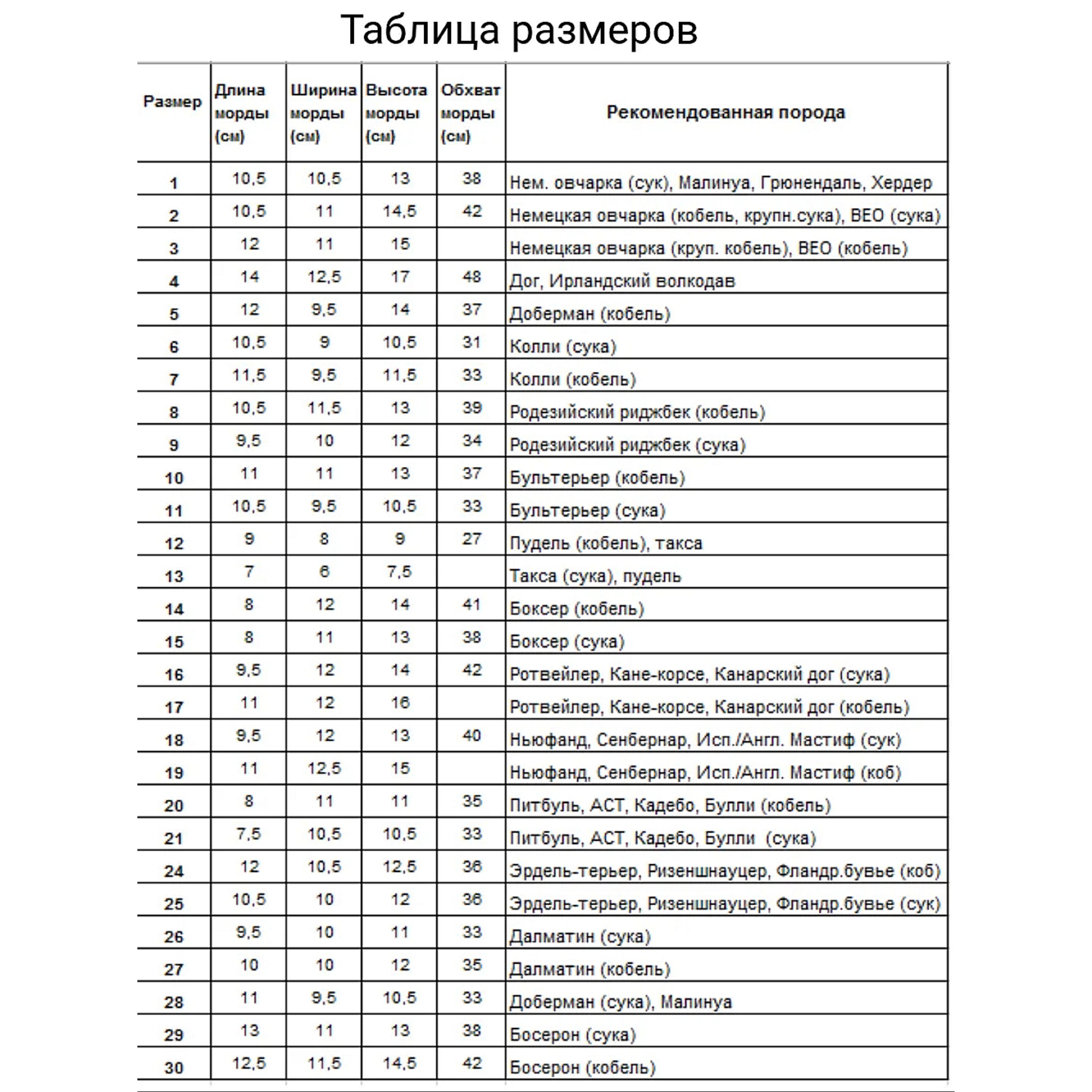 Помните что в зависимости от размера конфигурация намордника меняется.